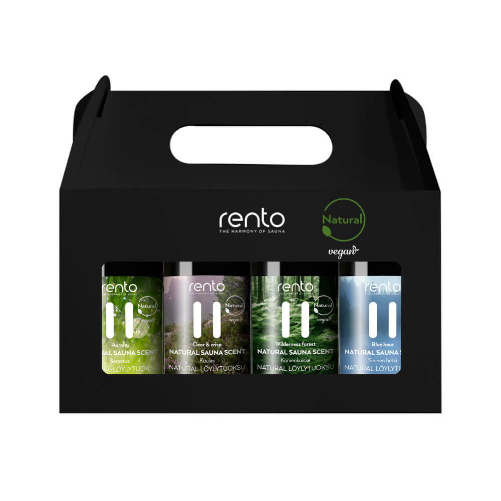 Die Geschenkbox enthält 4 × 100 ml Bio Saunaufgüsse.