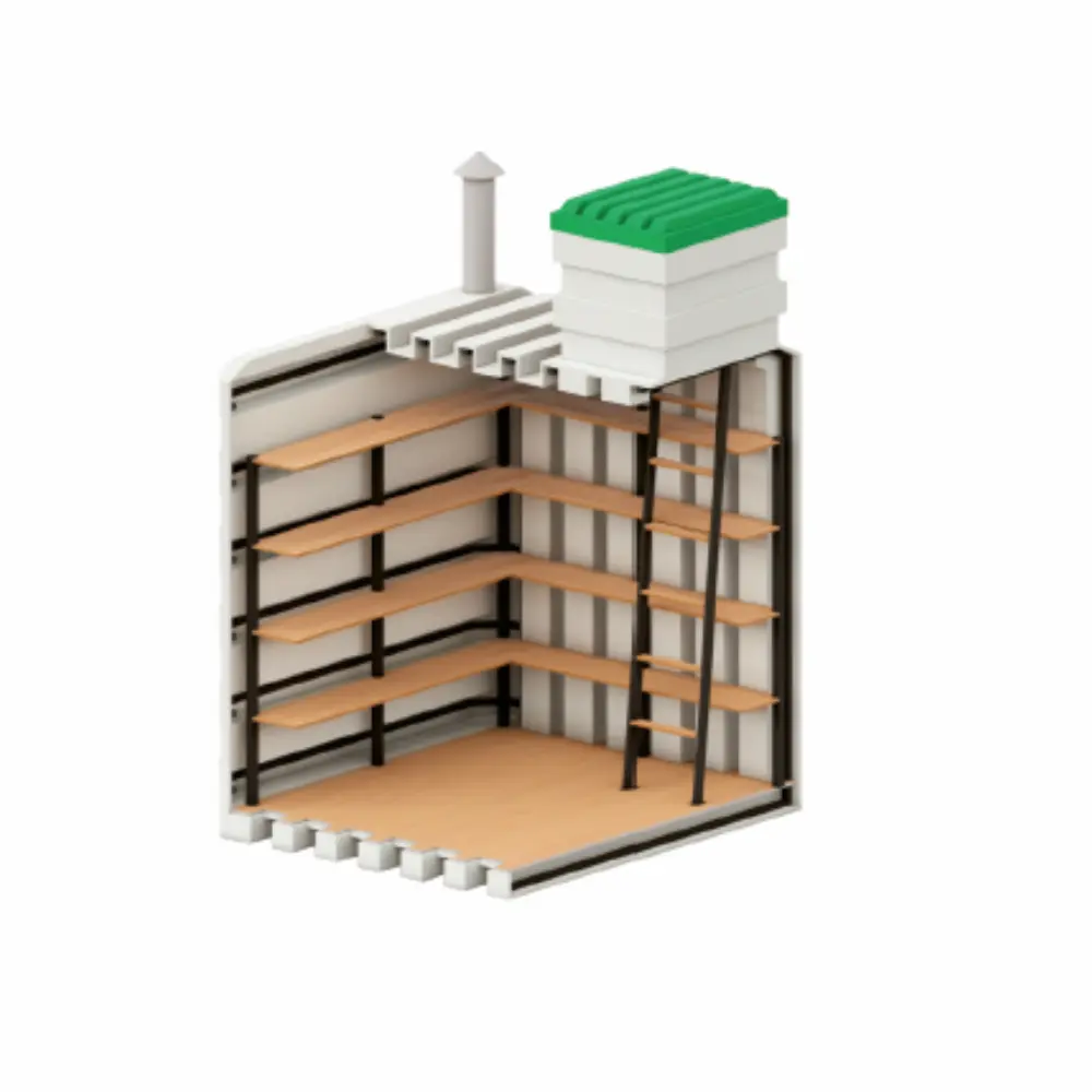 - fertig installierte Regale auf 4 Ebenen aus lackiertem, wasserdichtem Sperrholz 18 mm