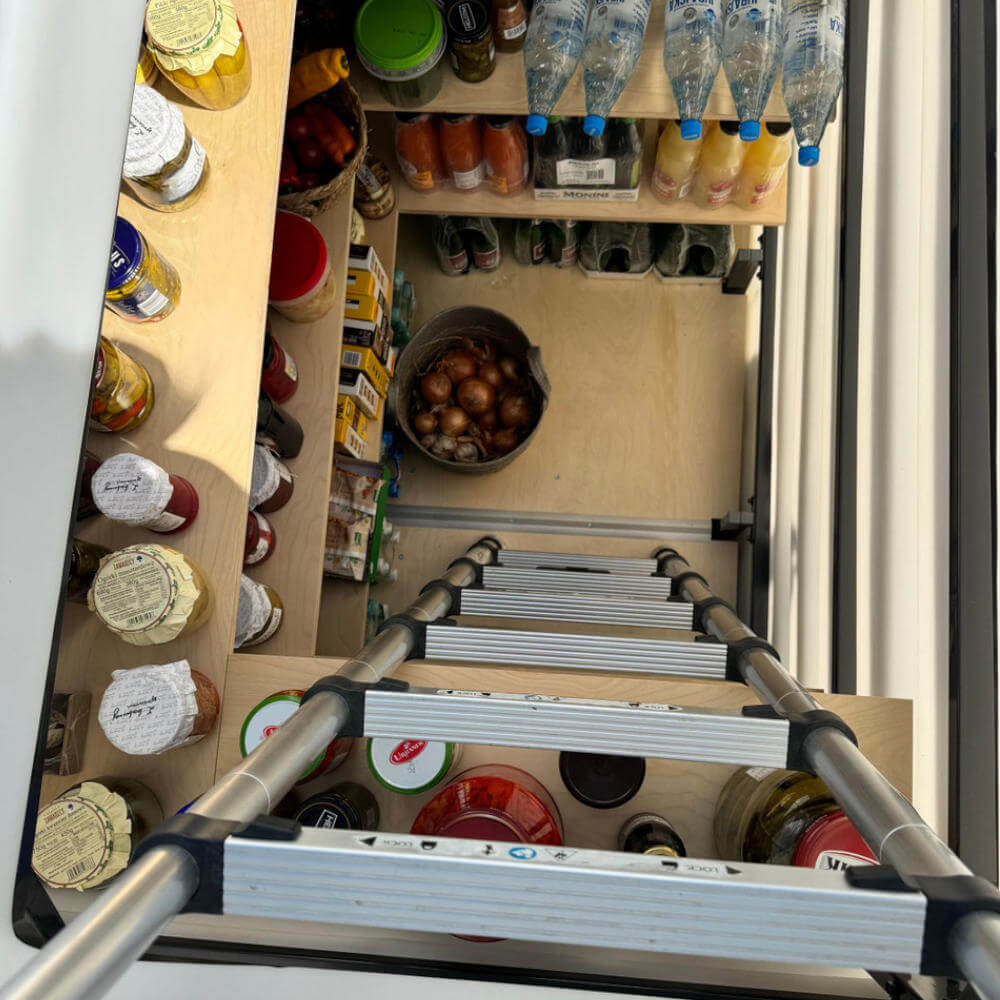 - fertig installierte Regale auf 3 Ebenen aus lackiertem, wasserdichtem Sperrholz 18 mm