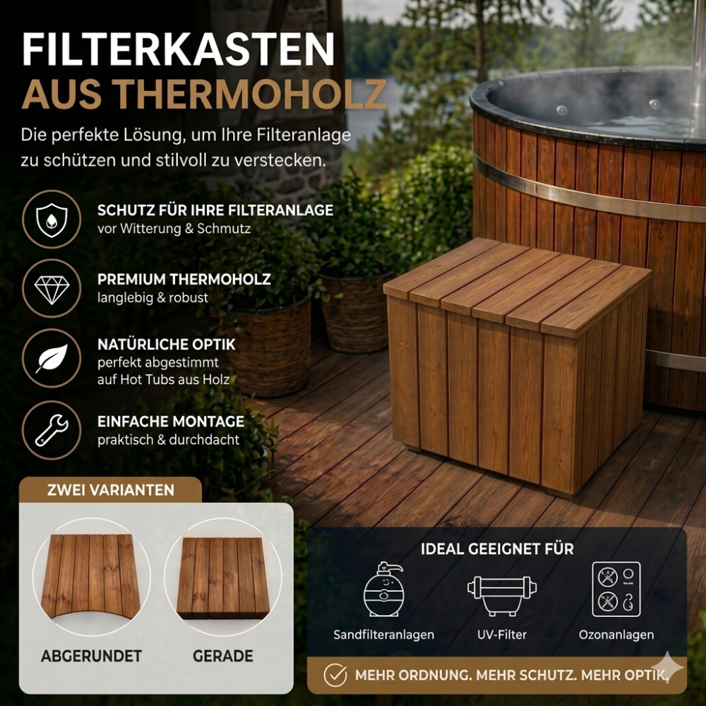 Mit unserem Filterkasten aus Thermoholz integrieren Sie Ihre Filteranlage stilvoll und geschützt in Ihre Hot Tub Umgebung.