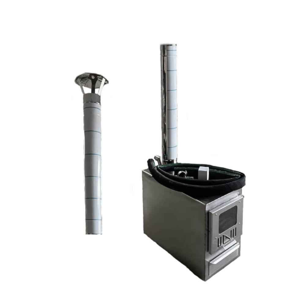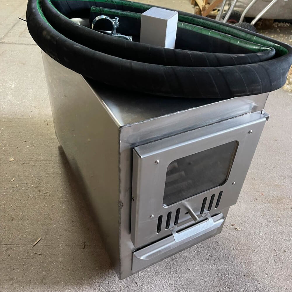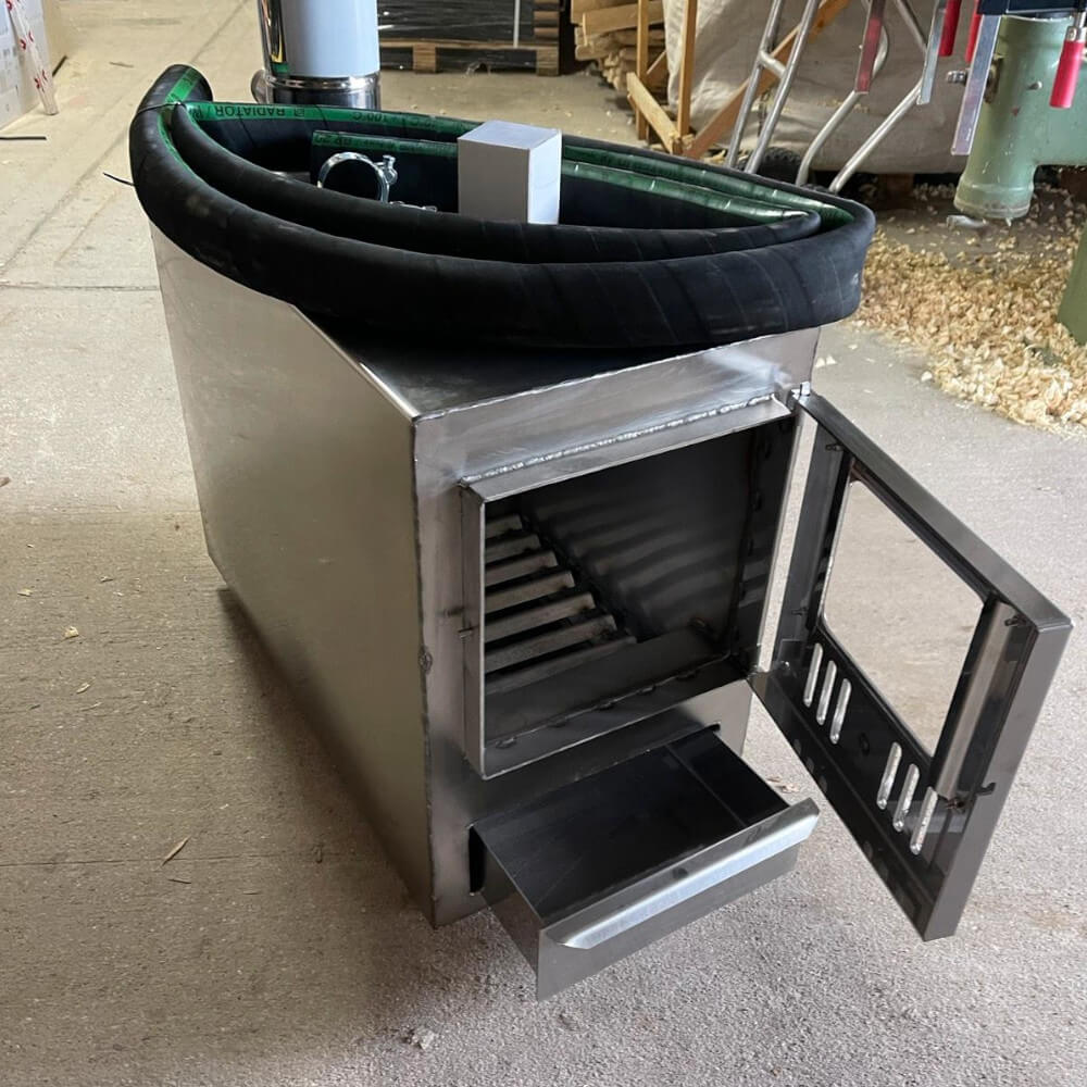 Leistungsstarker externer Edelstahl-Ofen für Ihren Hot Tub oder Badeofen, ideal für entspannte Wellnessstunden. Der Ofen wird inklusive Schornstein und Anschlussset geliefert und ist in zwei Ausführungen erhältlich: