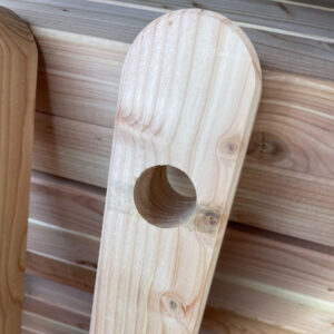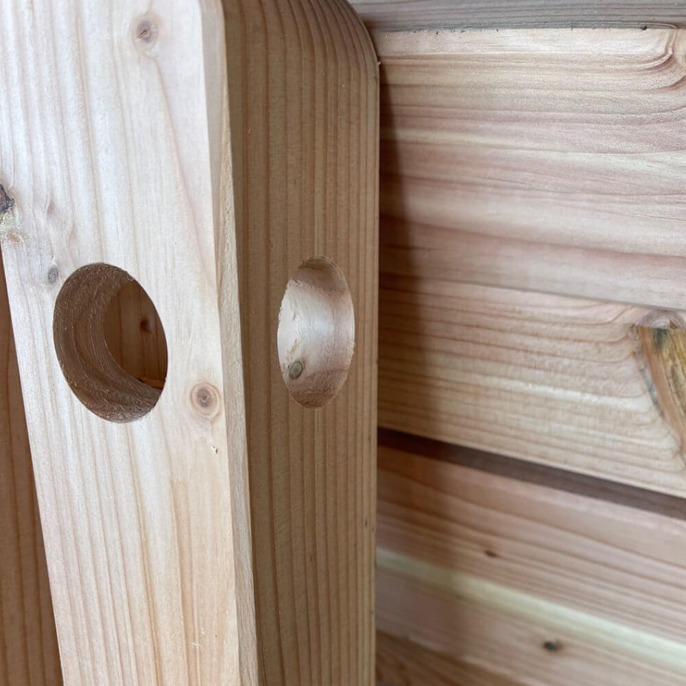 Da es sich um Naturholz handelt, können Astlöcher, Farbabweichungen oder Dehnungsrisse auftreten – insbesondere durch die 45-mm-Bohrung. Diese Eigenschaften sind holztypisch und stellen keinen Mangel dar. Naturjuteseile können sich bei Nässe leicht zusammenziehen, daher sollten die Schlaufen etwas großzügiger gestaltet und das Seil in jedem Pfosten mit einer Schraube fixiert werden.